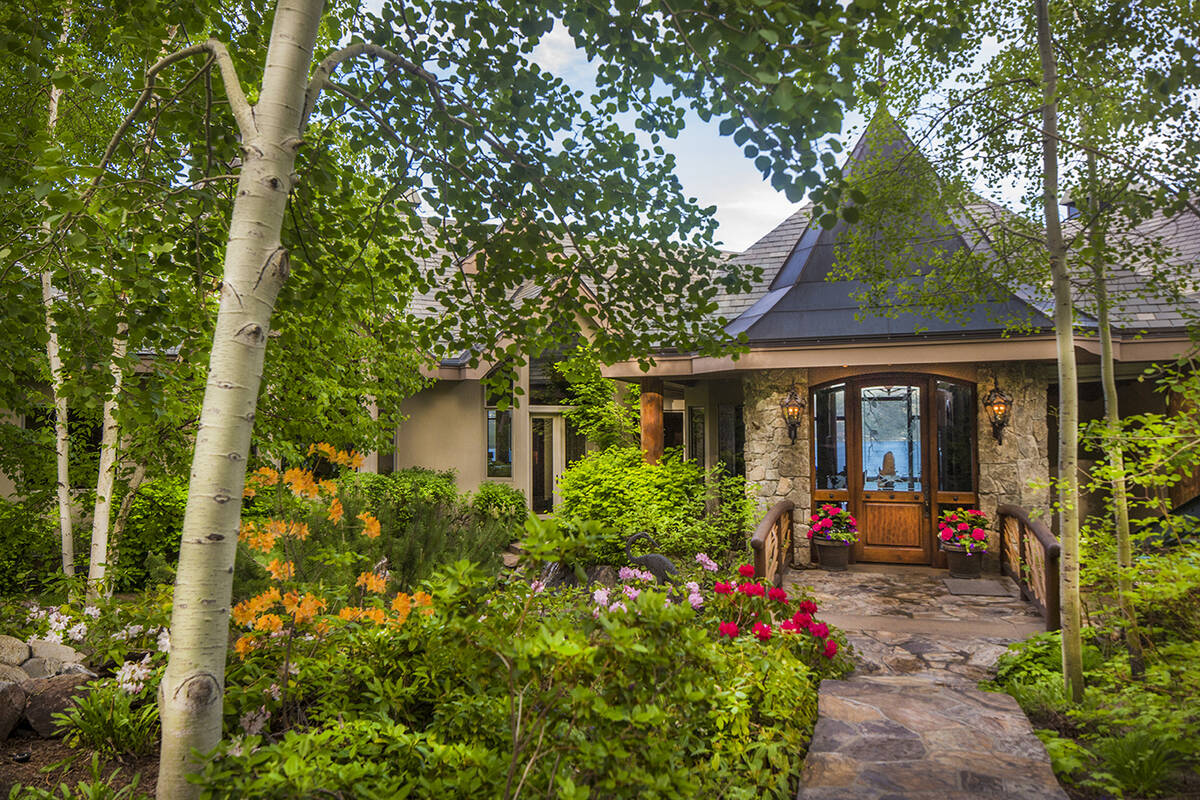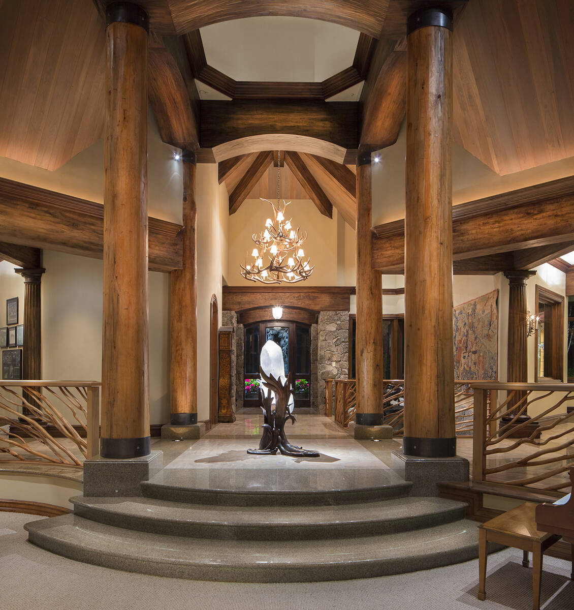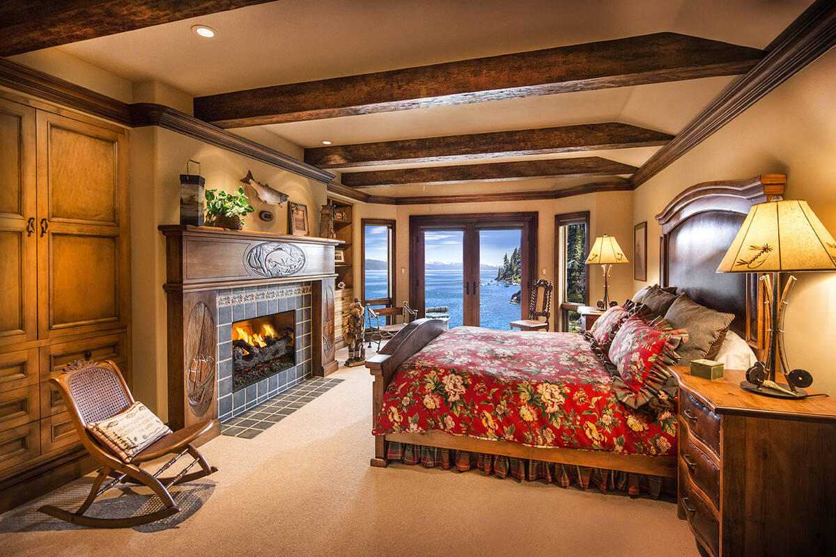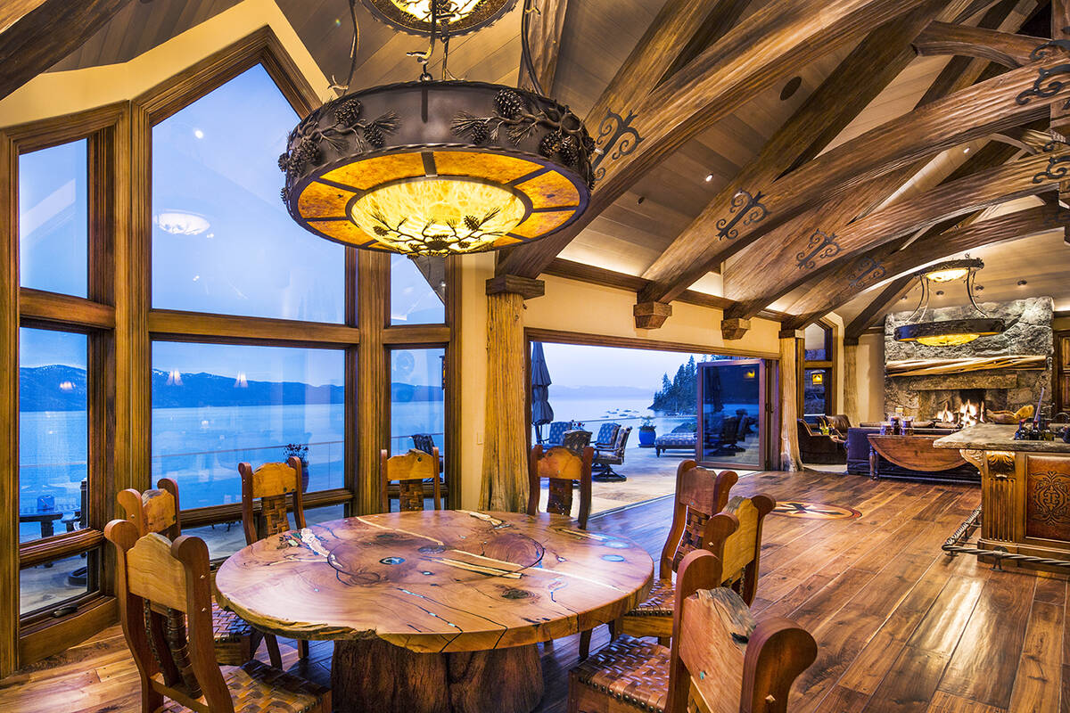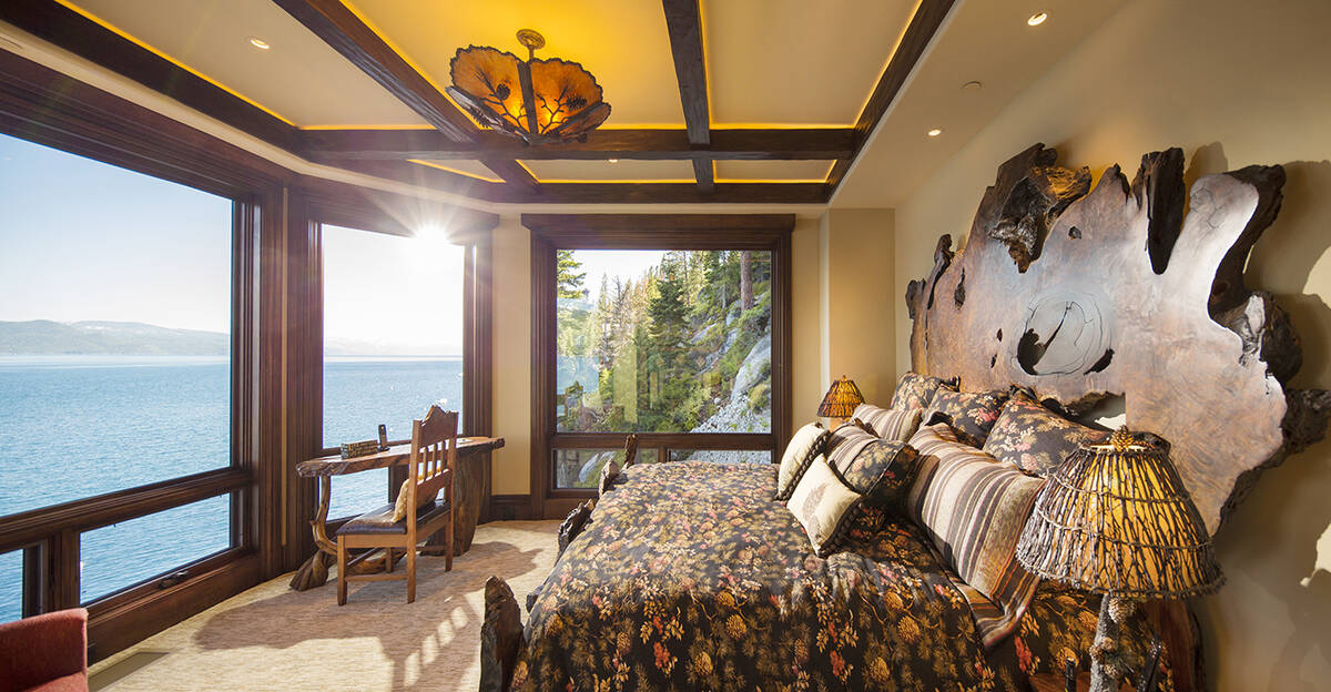 The estate encompasses 5.1 private acres sited across two lakefront parcels. It offers 525 feet of lakefront with a terraced beach, four buoys and a newly acquired pier permit. Selected during a recent Lake Tahoe pier lottery, the property’s asking price reflects future pier construction. Entry into the property flows through lush, custom-designed gardens, filled with flowering plants, trees, ponds, waterfalls and a meditation area. Custom wood animal sculptures indigenous to the area are found throughout the space, including serving as the garden’s centerpiece.