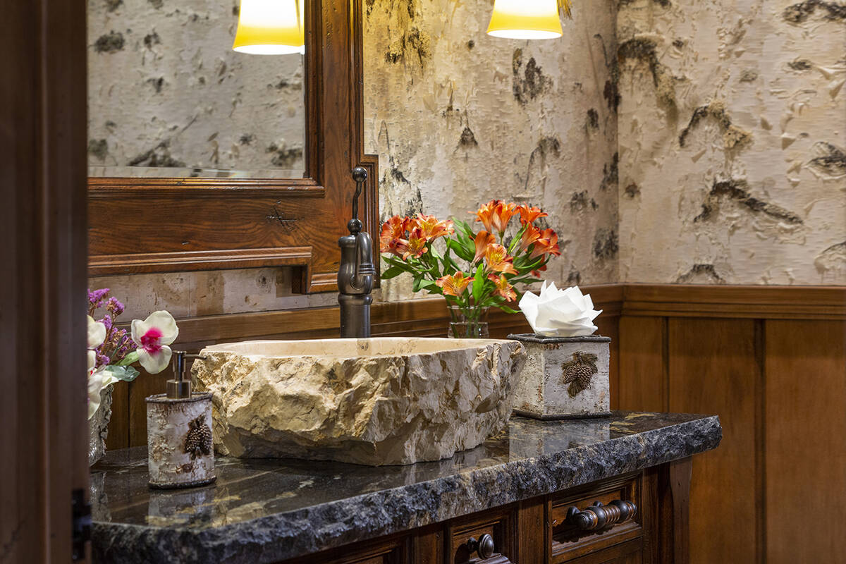 The couple’s distinct character is reflected within the warm, inviting classic Tahoe design enveloping the floor-to-ceiling windows, custom-designed fireplaces, wood vaulted ceilings, grand wood pillars and customlighting. It is also expressed by the intricate detailing throughout.