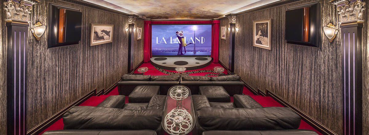 The movie theater’s unique design, including a 16-foot screen, and custom down-filled leather seats, captures a heightened viewing experience.
