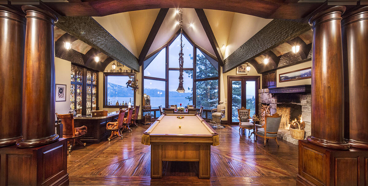 In addition to the stunning views, the distinctive property features eight bedrooms, 12 baths, formal dining and living rooms, 13 fireplaces, primary bedroom office with leather door inlays and a Brazilian mahogany library, an old English pub-inspired billiards room with bar, 1,687-bottle wine cellar, game room and caretaker’s apartment.