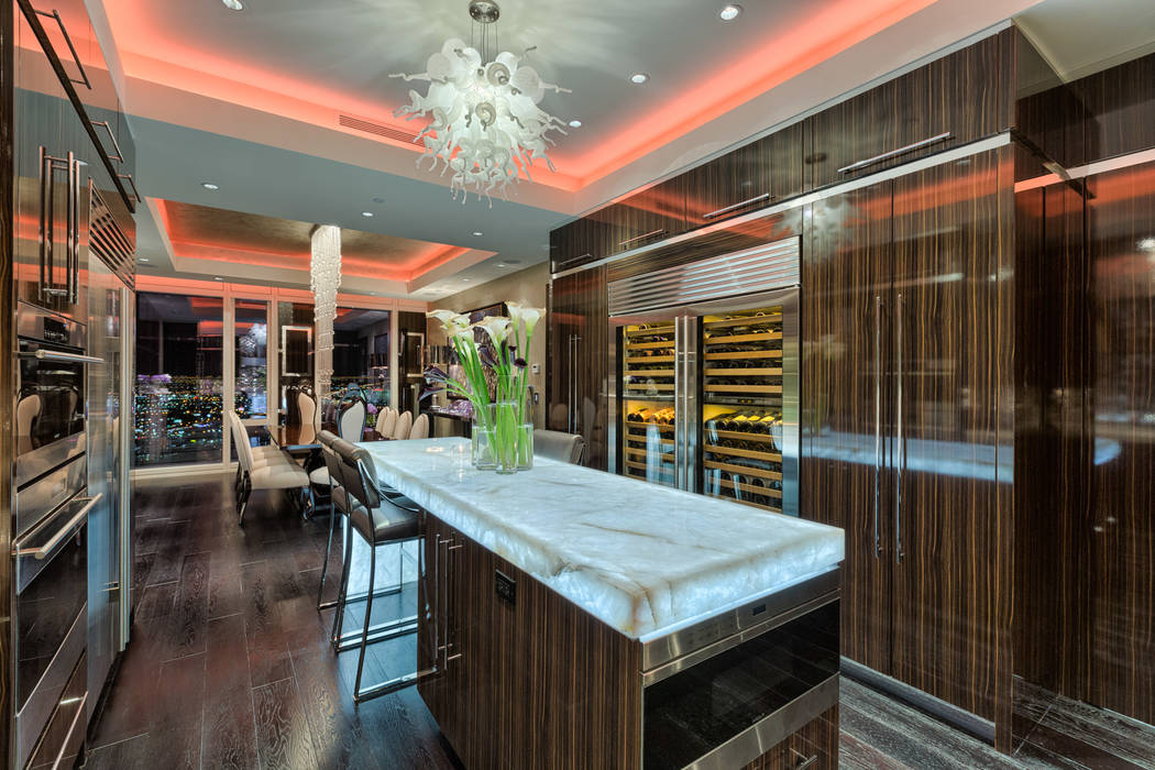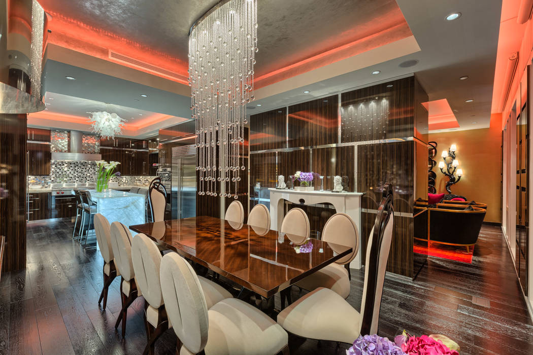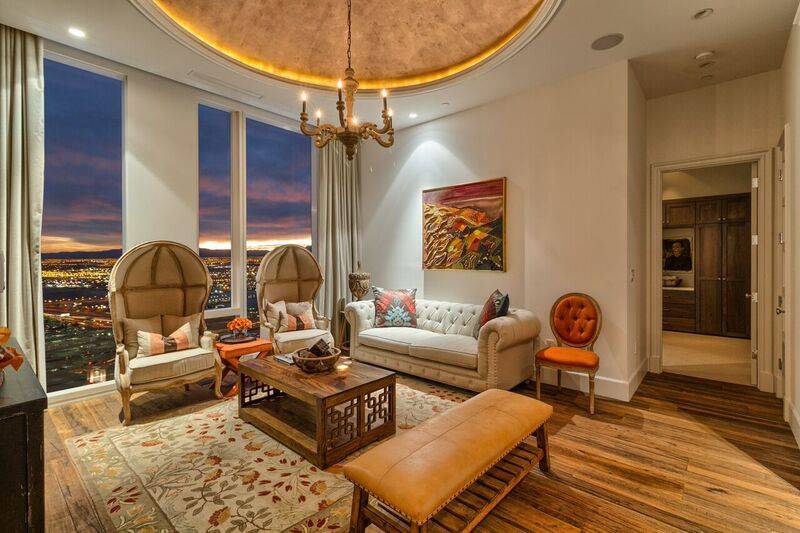 Penthouse 4702 overlooks the Strip from the Waldorf’s top floor. The fully furnished penthouse is privately listed for $6.75 million through Manley.