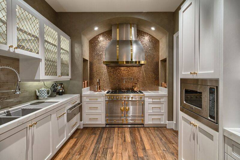 The white gourmet kitchen captures the European essence with an imported French La Cornue gas stove accentuated by a copper penny tile backsplash and custom stainless steel hood. Solid wood custom cabinetry accented with imported polished brass handles and custom grates provide a refined aesthetic. Professional grade appliances, walk-in pantry and casual bar dining complete the package.