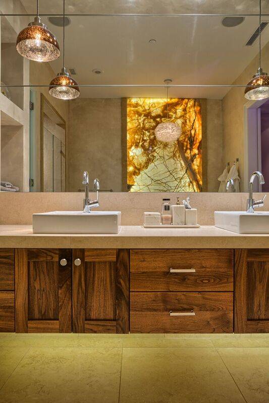 The stunning focal point is a custom-designed, illuminated White Diamond quartzite waterfall-edged island.