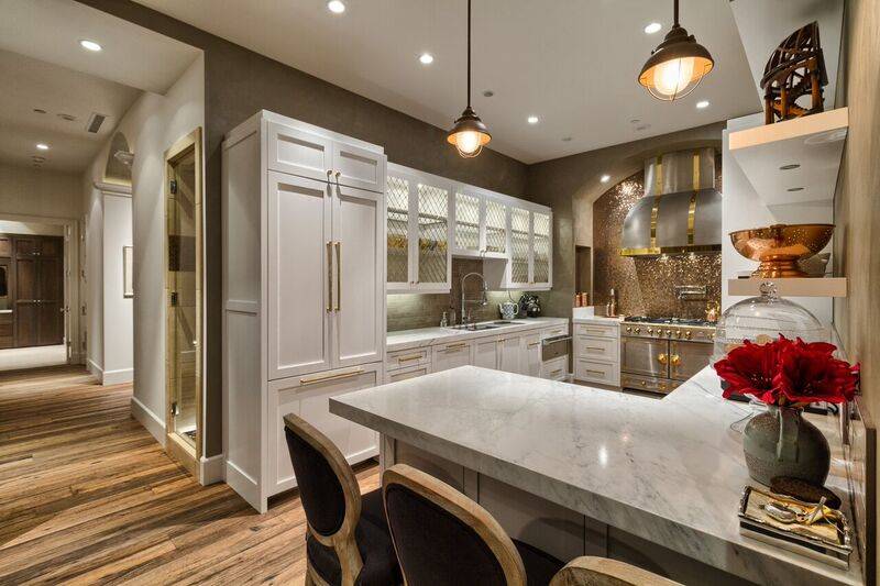 The gourmet kitchen features professional-grade appliances, custom stainless steel hood, Murano blown glass chandelier, white diamond quartzite counters contrasted by dark artisan ebony tiger veneer cabinetry.