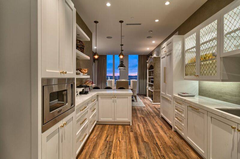The two elegant master suites flanking the penthouse showcase 13-foot coffered ceilings, Venetian plaster walls, custom lighting and floor-to-ceiling windows. The main master includes a walk-in closet and a unique custom barn door master bath entry.