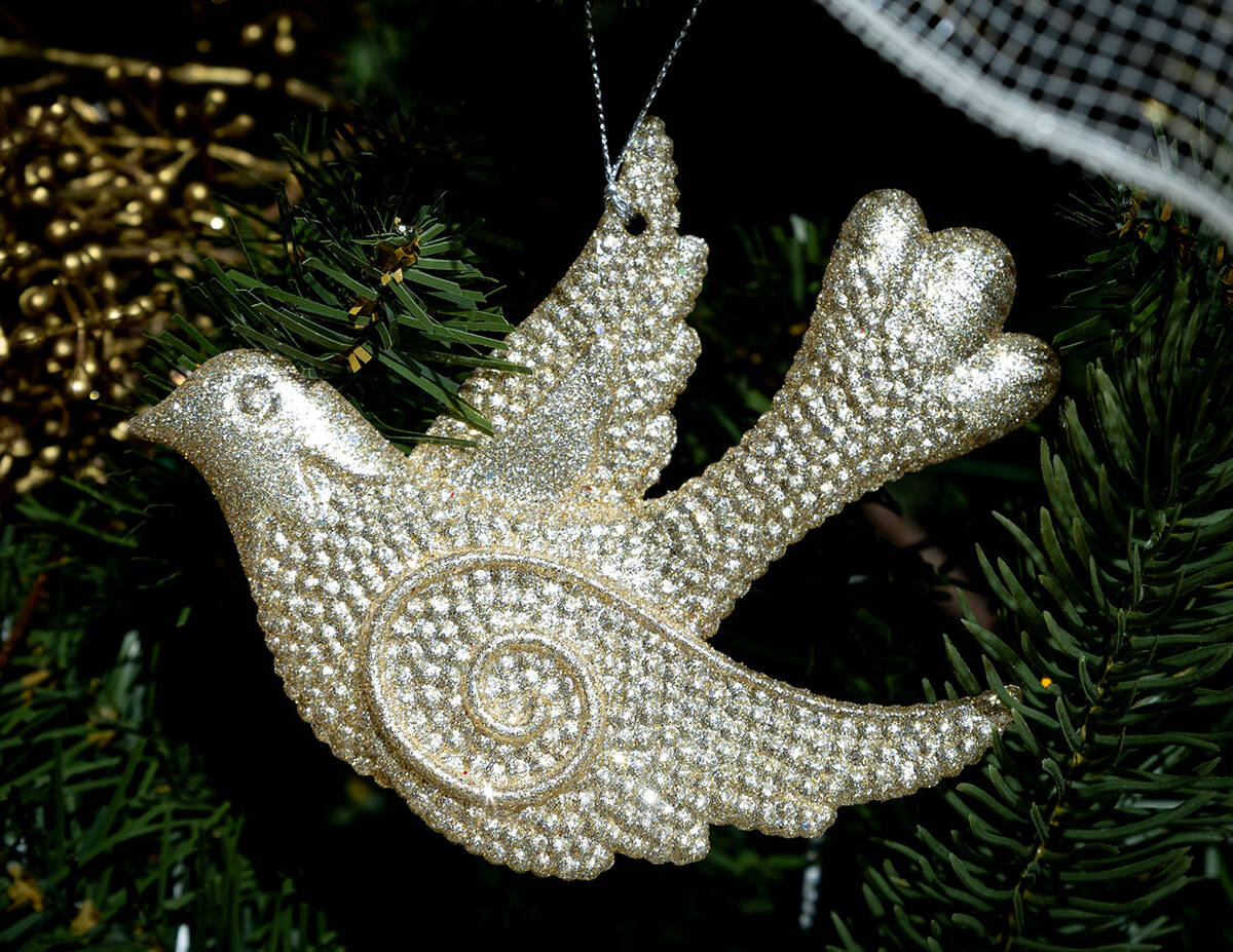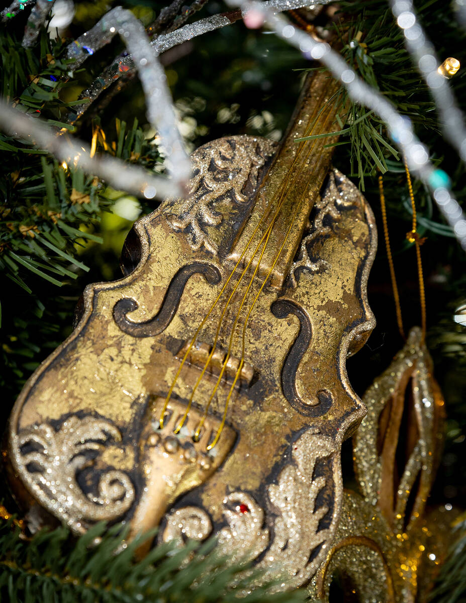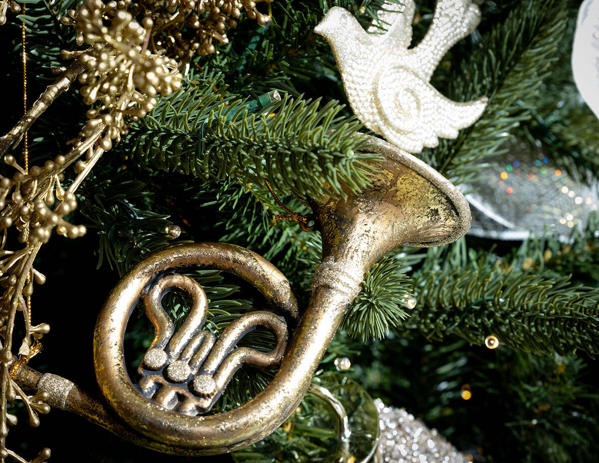 Taking advantage of the soaring ceilings, Sullivan installed a 15-foot Christmas tree in the main living area. She adorned the tree with miniature gold instruments, oversized ornaments, golden mesh ribbon, glittery doves and angels. A trio of gold angels with trumpets stands next to the tree.