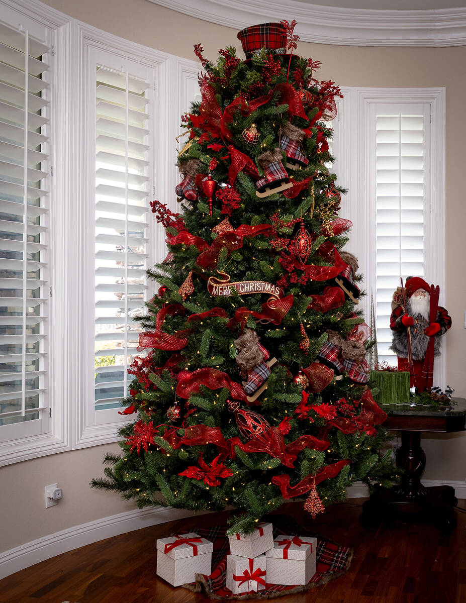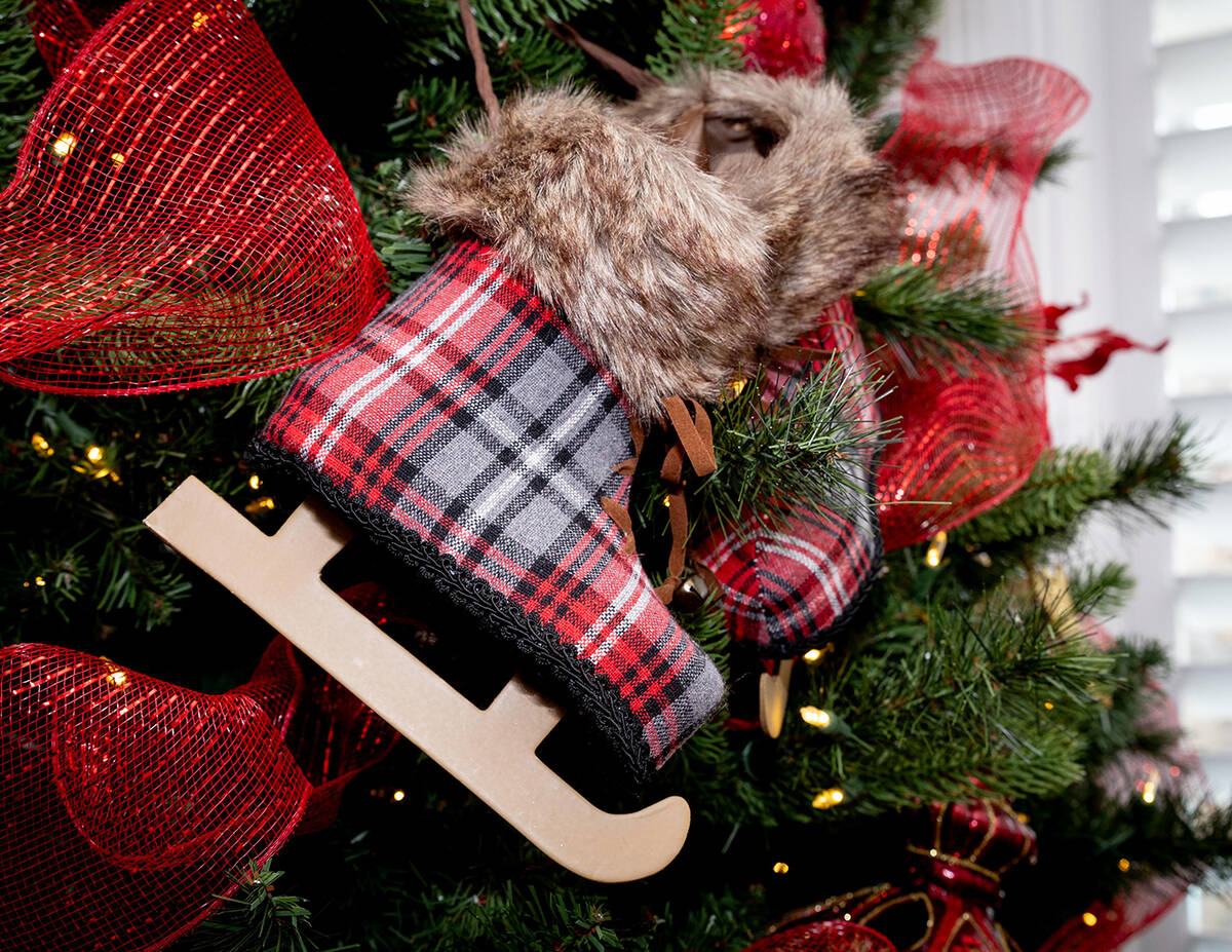 A 12-foot tree takes center stage in the main living area. Lit with white lights, it features shiny red mesh ribbon, poinsettias, oversized red ornaments, red berry picks and pairs of faux-fur trimmed plaid ice skates. A plaid tree skirt and top hat tree topper complete the overall theme.