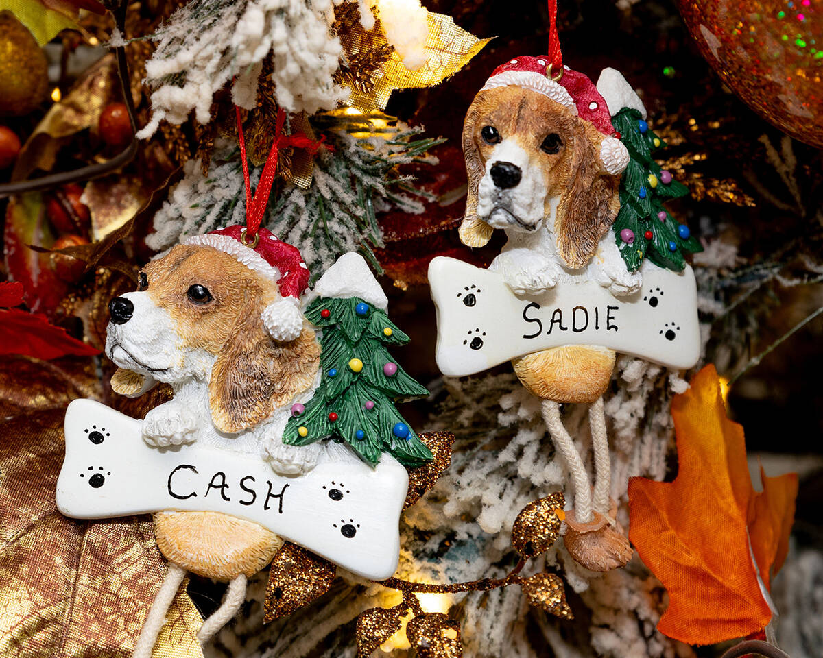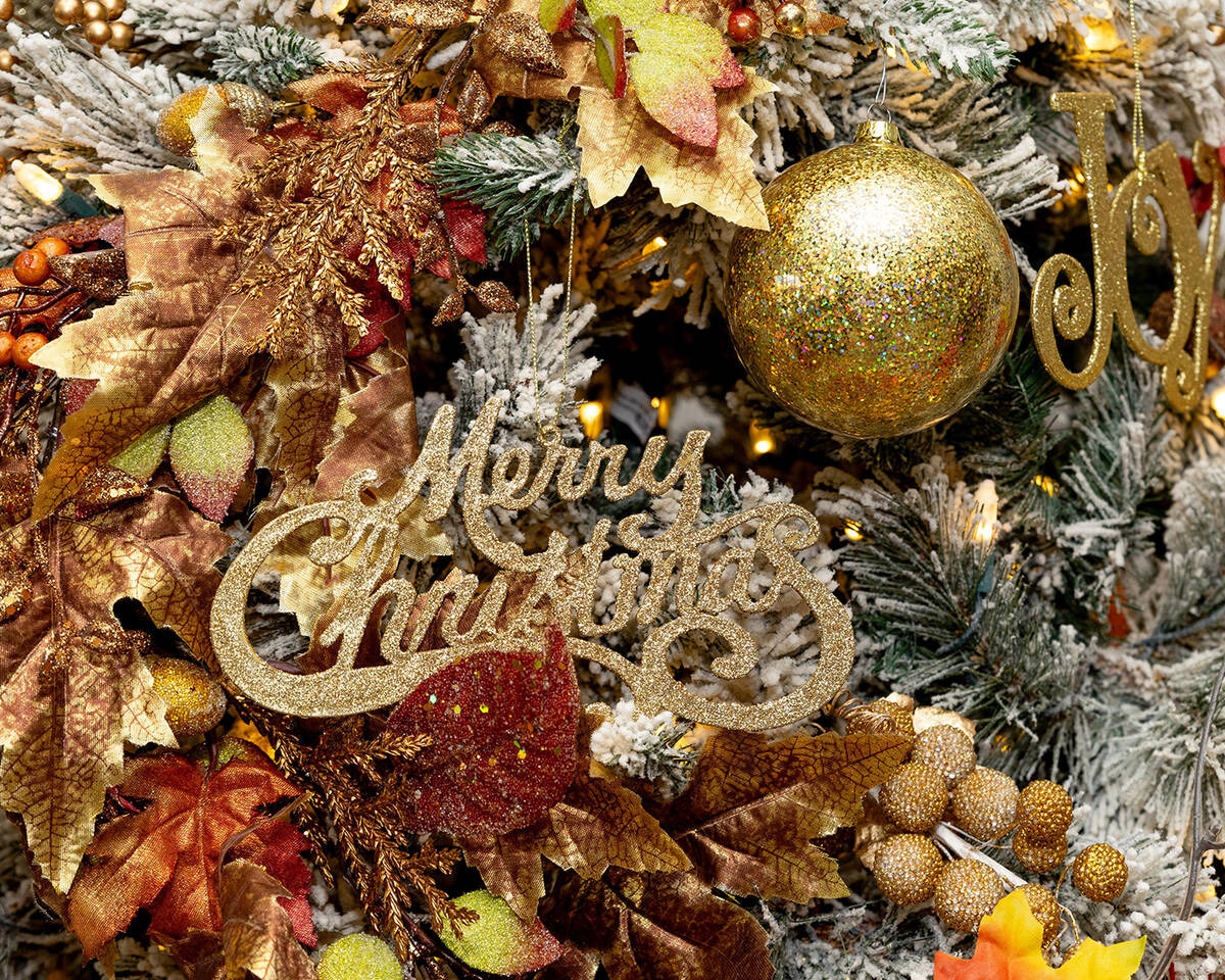 Glittery gold cursive Merry Christmas and Joy ornaments play off the various-sized warm-toned ornaments. In the tree’s center, two beagle ornaments represent their dogs: Sadie and Cash. Picks of gold berries and leaves fill the tree’s top, while an exotic cheetah-trimmed skirt finishes the theme. Sullivan added small touches such as tabletop Santas and gold packages to complete the arrangement.