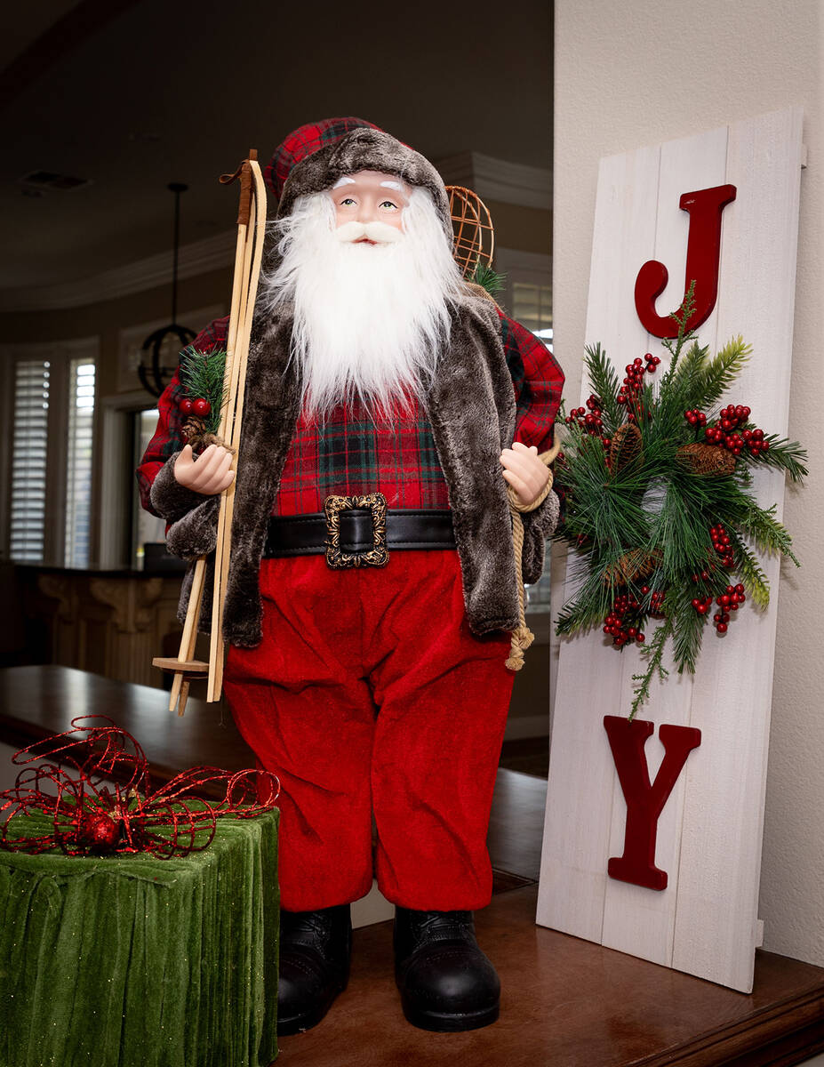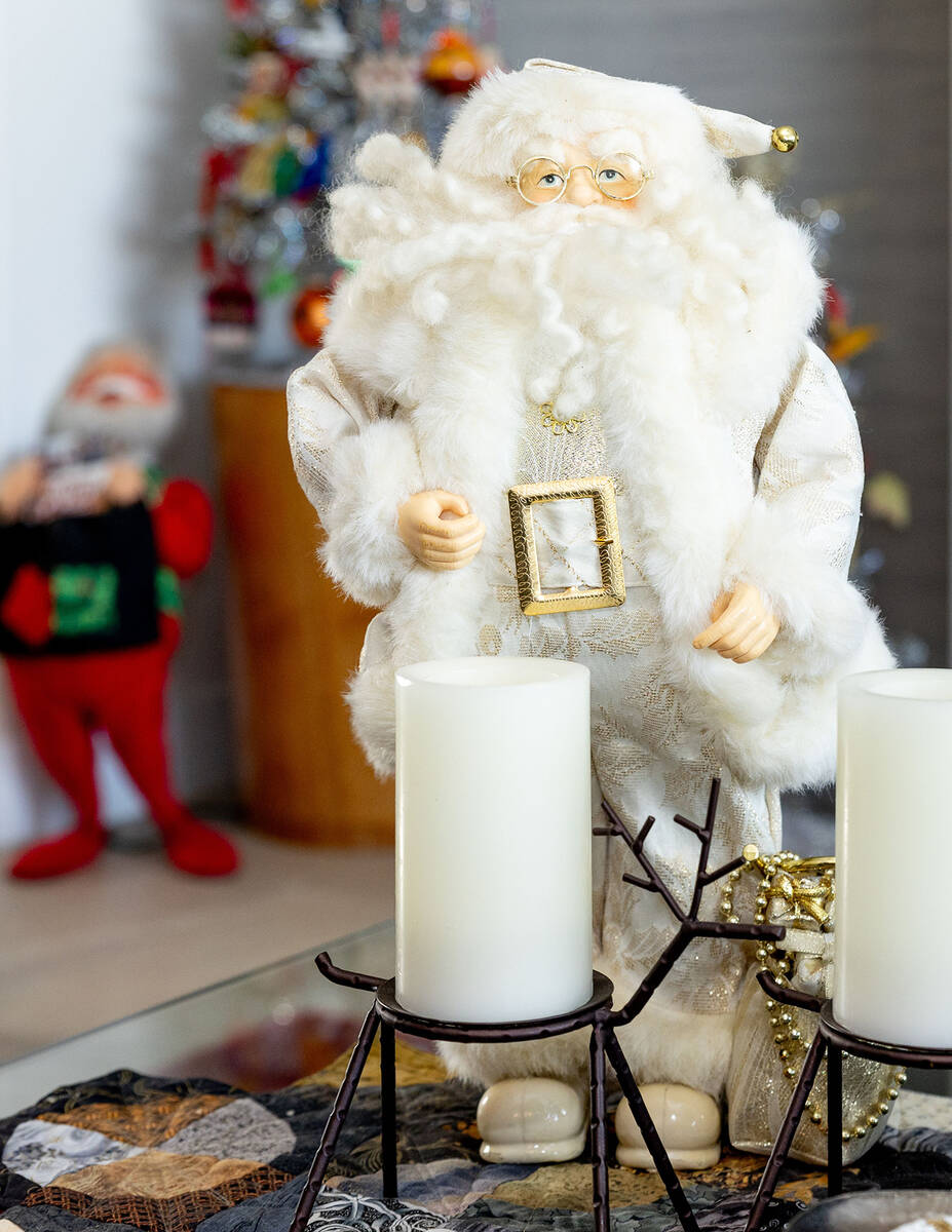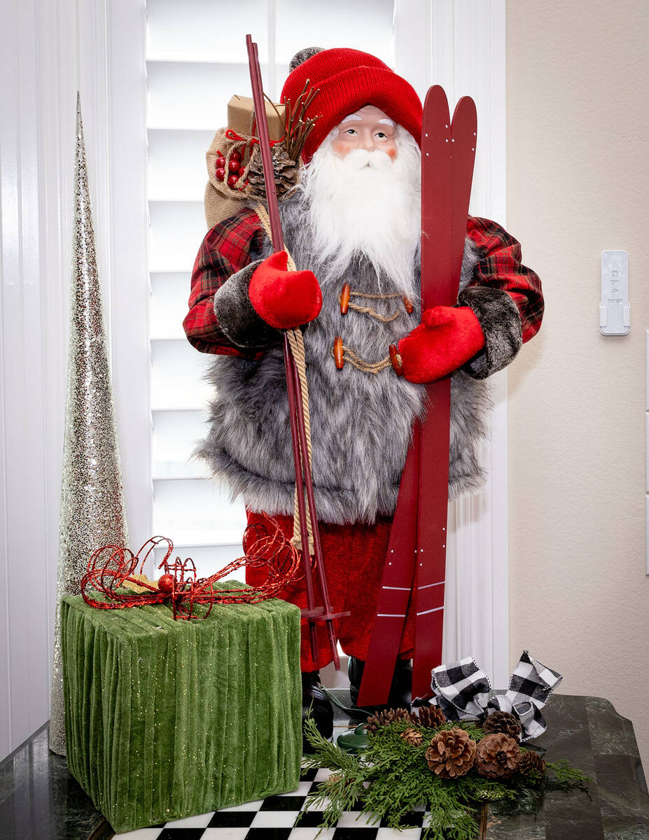 Next to the fireplace, a 4-foot vintage-styled Santa dressed in an ivory fur-trimmed hooded sweater stands holding a package and a Christmas tree. Flanked by a trio of tall gold cone trees, the Santa vignette warms the space using neutral tones and integrating different textures. Lighted birch branches set against the wall add to the visual effect.