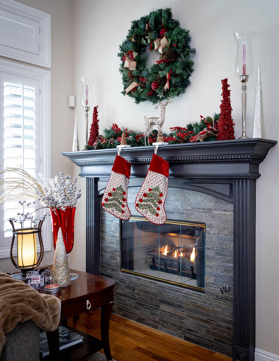 Sullivan decorated the fireplace using a central green wreath with plaid ornaments and burlap ribbon placed on the wall above the mantel. Accentuating the wreath, Sullivan decorated the black wood mantel using a mix of silver cone-shaped trees and red berry trees, tall silver hurricane taper holders and a central green garland with red berries, pine cones and burlap ribbon. Discrete wood tree stocking holders display two knit stockings hung by the firelight. Cozy red and white check pillows and reindeer-themed throws liven up the gray couch and finish the comfortable, inviting atmosphere.