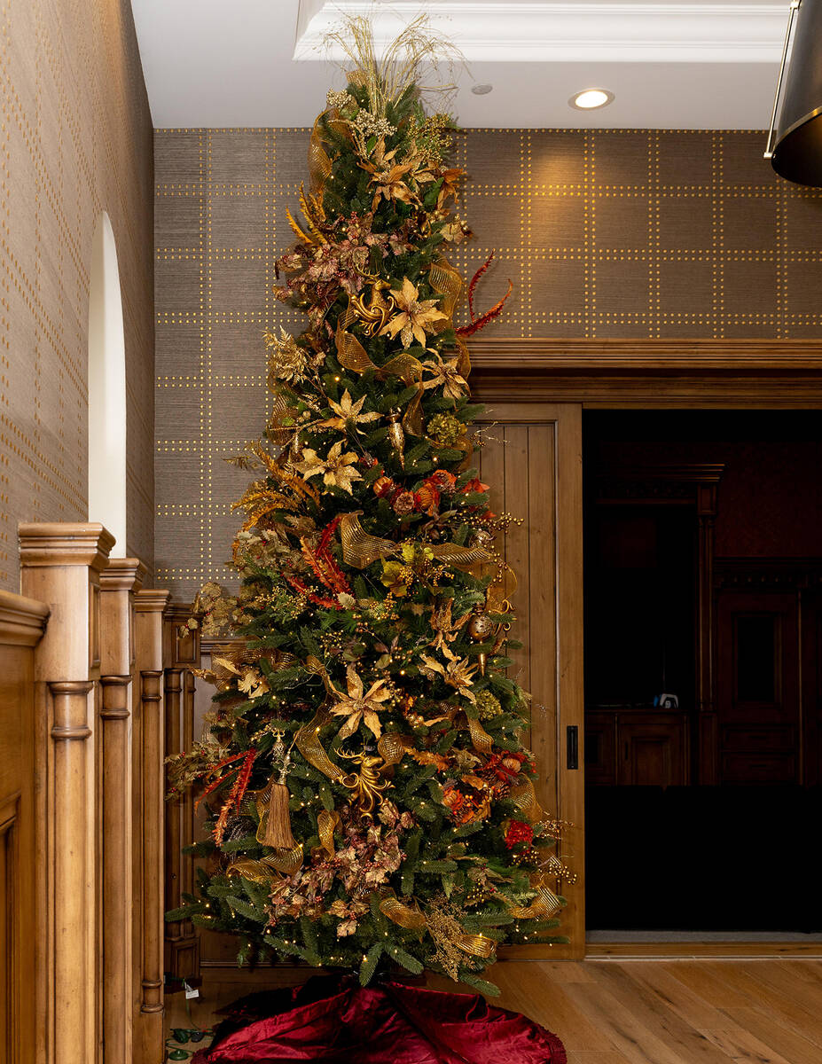 On the other side of the room, Sullivan incorporated burnt orange and gold tones into the central flocked, 7½-foot Christmas tree, complementing the warm tones of the couple’s interior and extensive art collection.