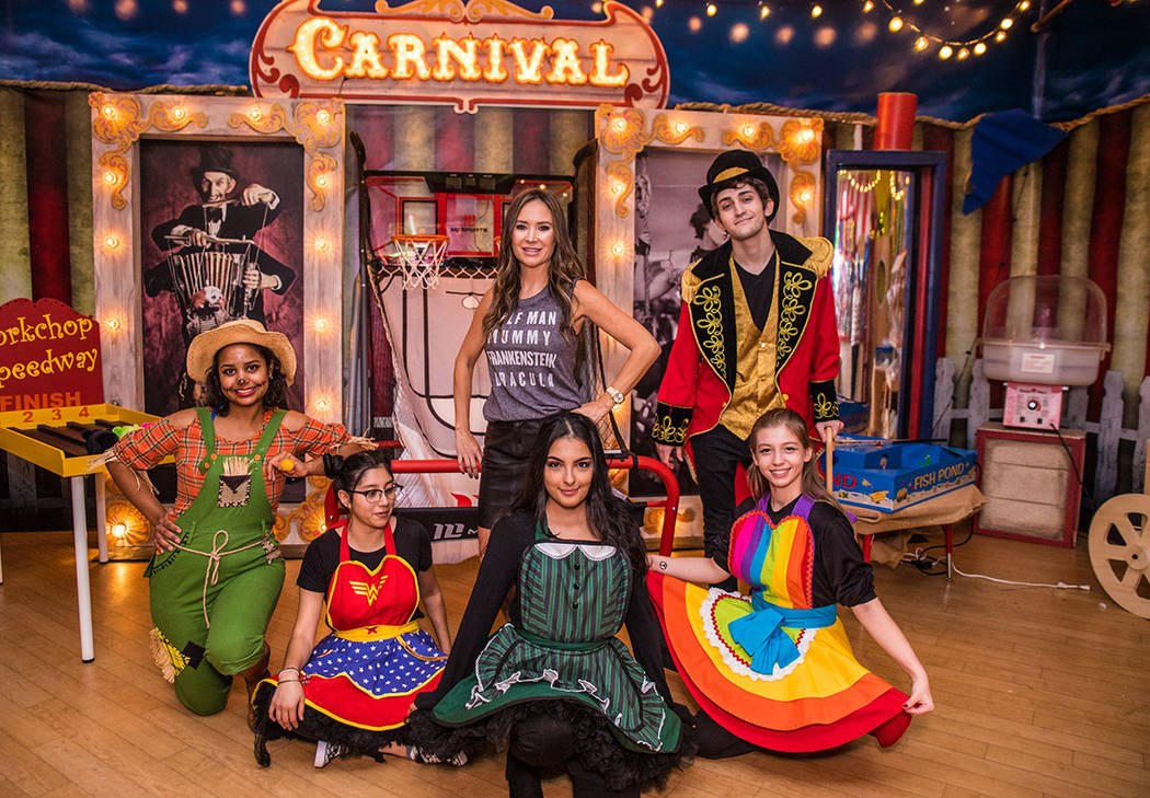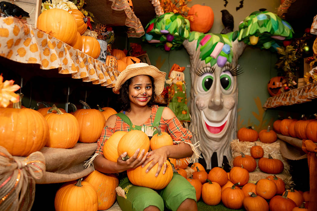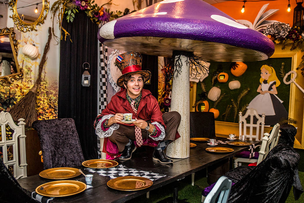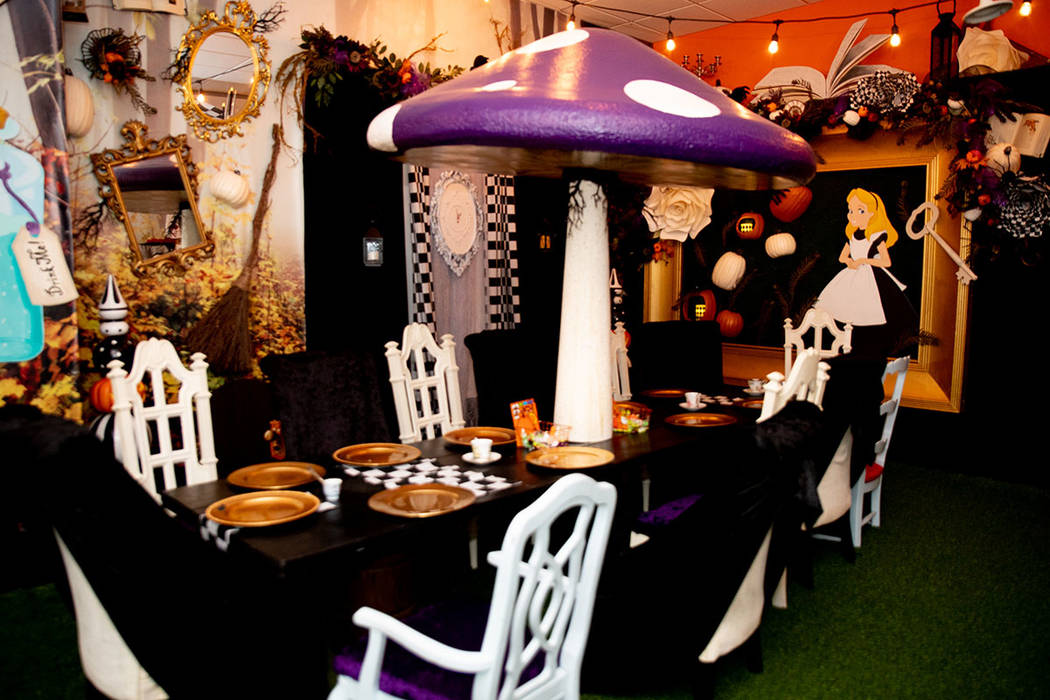 The rooms include a carnival room, complete with classic games, immersive lights and sounds; a witch’s mansion where sensory items like a zip line and rock climbing wall keep kids engaged; an interactive haunted house replica with a candy witch, organ playing ghost, and a scarecrow escort; a slime factory, and a pumpkin patch where kids can select a pumpkin to take. It culminates in a venture down a rabbit hole leading to, you guessed it, the Alice in Wonderland room, where kids can decorate their pumpkin while drinking tea. The visit, designed to last 55 minutes, ends with a family photo.