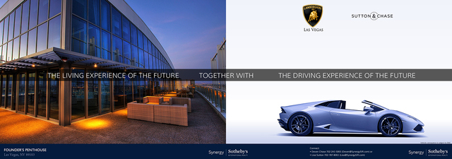 “The sale of the Founder’s Penthouse, paired with the Lamborghini Huracan now offers a completely incomparable living and driving experience,” said co-listing agent Deven Chase, managing partner of Elite Homes U.S. and a Realtor at Synergy Sotheby’s International Realty. “Special thanks to Tom Brazill, (general sales manager) of Lamborghini Las Vegas, for collaborating in this divine, first-of-its-kind partnership.”