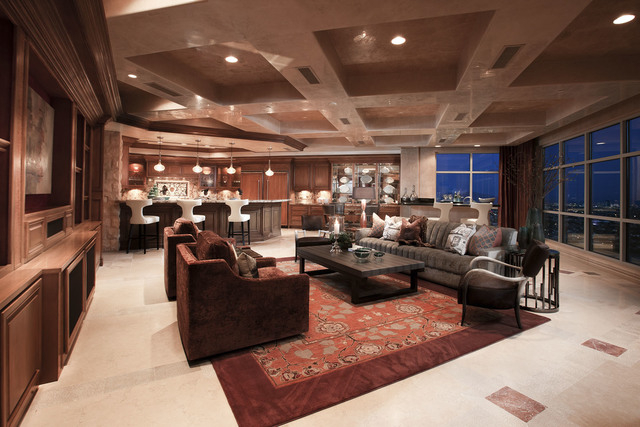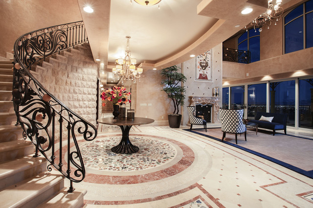 The furnished, two-story European-themed Crown Penthouse is 15,560 square feet of livable space, and has a 15-car garage to park your favorite modes of transportation, a private elevator at ground level that opens into the 46-foot-high reception area, seven terraces spanning 3,000 square feet with panoramic views of the Las Vegas Valley. One terrace boasts a massive barbecue grill and private outdoor pool.