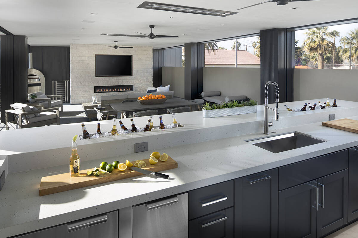 Additional seating and dining areas may be located nearby the outdoor kitchen. These outdoor gathering spaces can be covered by a gazebo, a foldable umbrella, drop-down screens or a rooftop overhang that provide a protective barrier from changing desert weather. Accessory fans and misting units can help circulate air and moisture during hot summer months while radiant heaters, fire pits and fire tables can bring warmth to a chilly desert night.