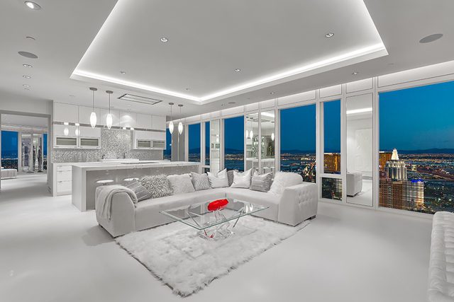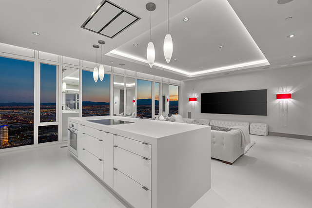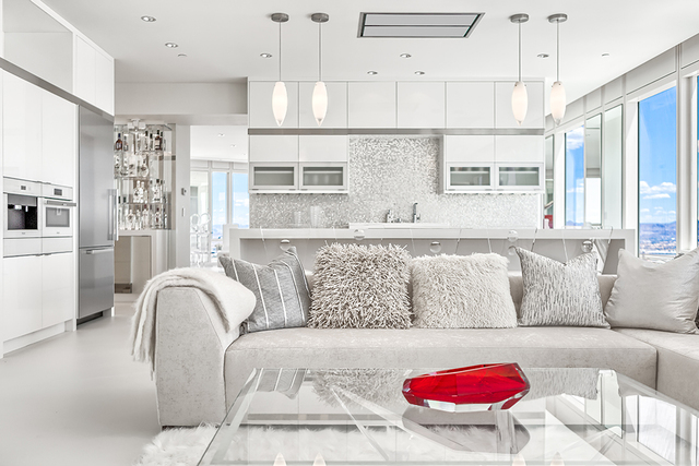 “After my clients purchased it, they decided to redesign the penthouse. Basically, they went down to the studs and rebuilt it. The white floors, walls and furniture create a sleek backdrop, and the buyer can personalize the space by bringing in accent pieces and artwork,” said Zand, who quickly credited Steve Jones of Merlin Contracting and design consultant Linda Tatum of L2 Luxurious Lifestyle Consultants for their efforts.