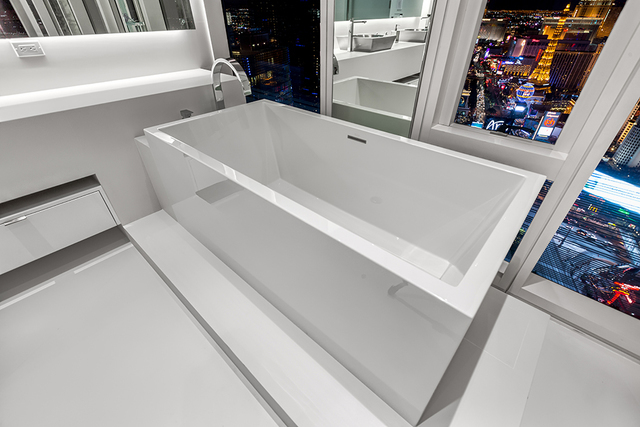 The bedroom “wing” of the home was concealed from the main living areas and accessible through a door that blended into a wall. Behind this door was a hallway decorated with a five-panel artwork that led to the two bedrooms decked out with — you guessed it — white, clean lines, white pillars, chandeliers, spa-like baths and views galore of the Las Vegas Valley.
