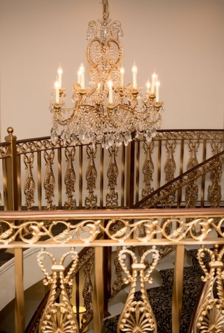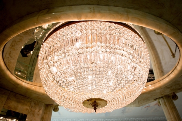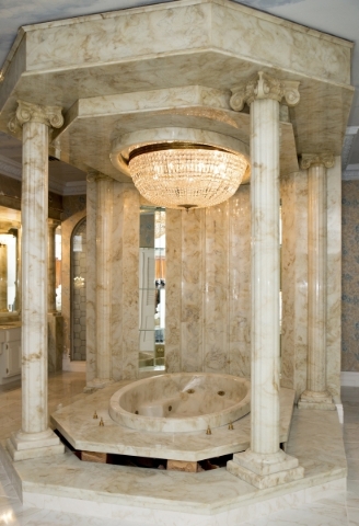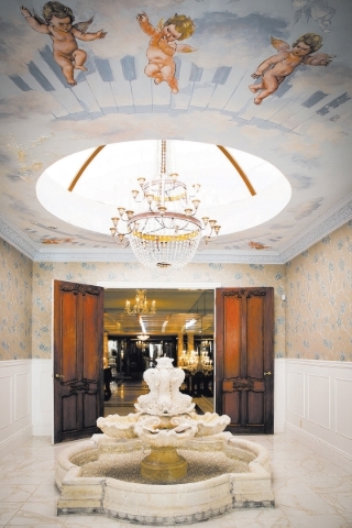 The “magic in the air” feeling is easy to understand with the mansion’s upscale, glamorous design. After all, there are several sparkling chandeliers and a grand staircase from Paris. Mirrored walls and bars feature etchings similar in style to that of English illustrator Aubrey Beardsley and also sport musical notes and the resemblance of Liberace. Eight marble pillars were imported from Athens, Greece, and there is a mural on the Sistine Chapel on the ceiling of the master suite and a ceiling mural depicting Liberace and cherubs looking down upon the master bath’s marble tub with golden swan fixtures. … Eclectic. Opulent. A showstopper. Just like Liberace himself.