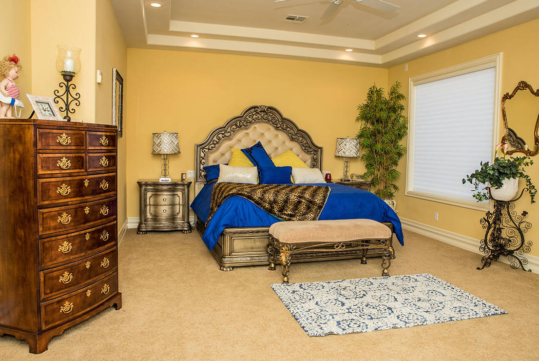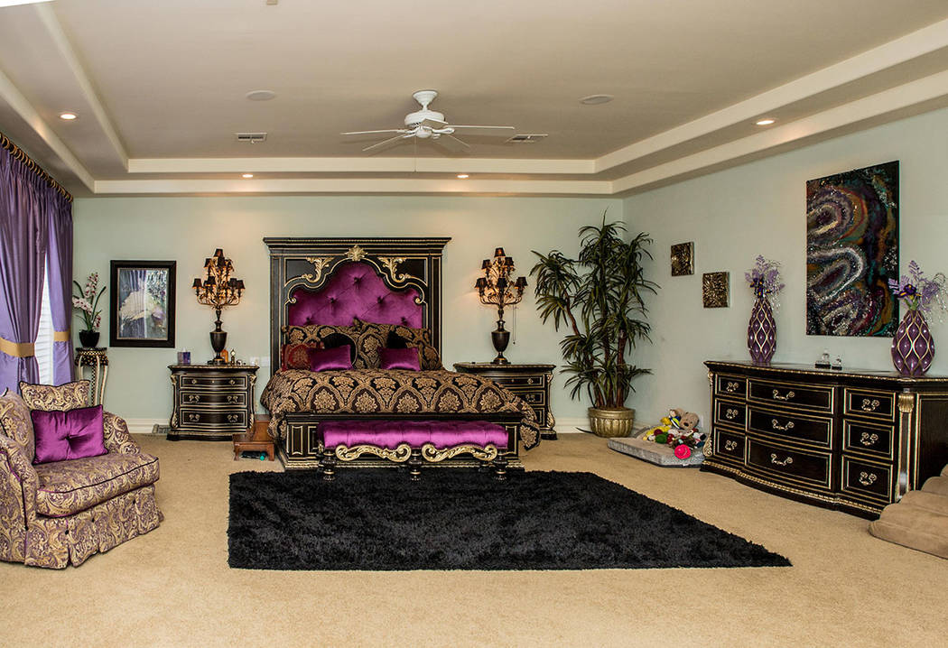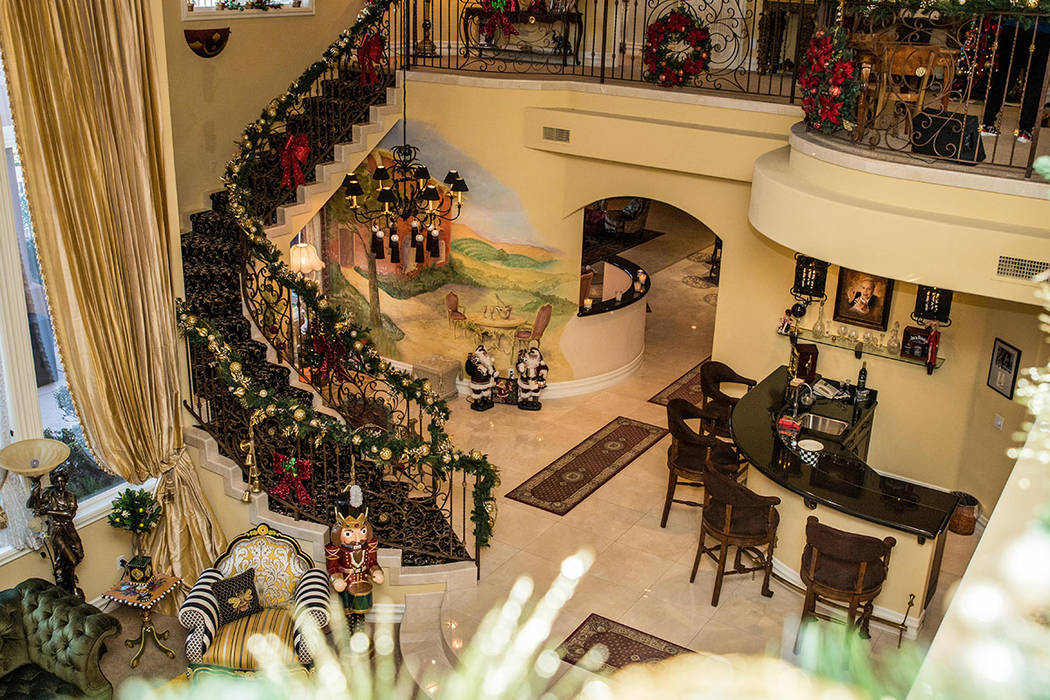 The two-story house, which was built in 1999, has a spacious, open floor plan, with six en suite bedrooms, seven baths and 9,600 square feet. From the white baby grand piano in the living room to the infinity-edged pool next to the golf course, it’s as if every room is arranged to welcome an infinite number of party guests at any time. A. wrought-iron staircase spans the width of the upper floor, which includes a six-seat home theater with tasseled velvet curtains.