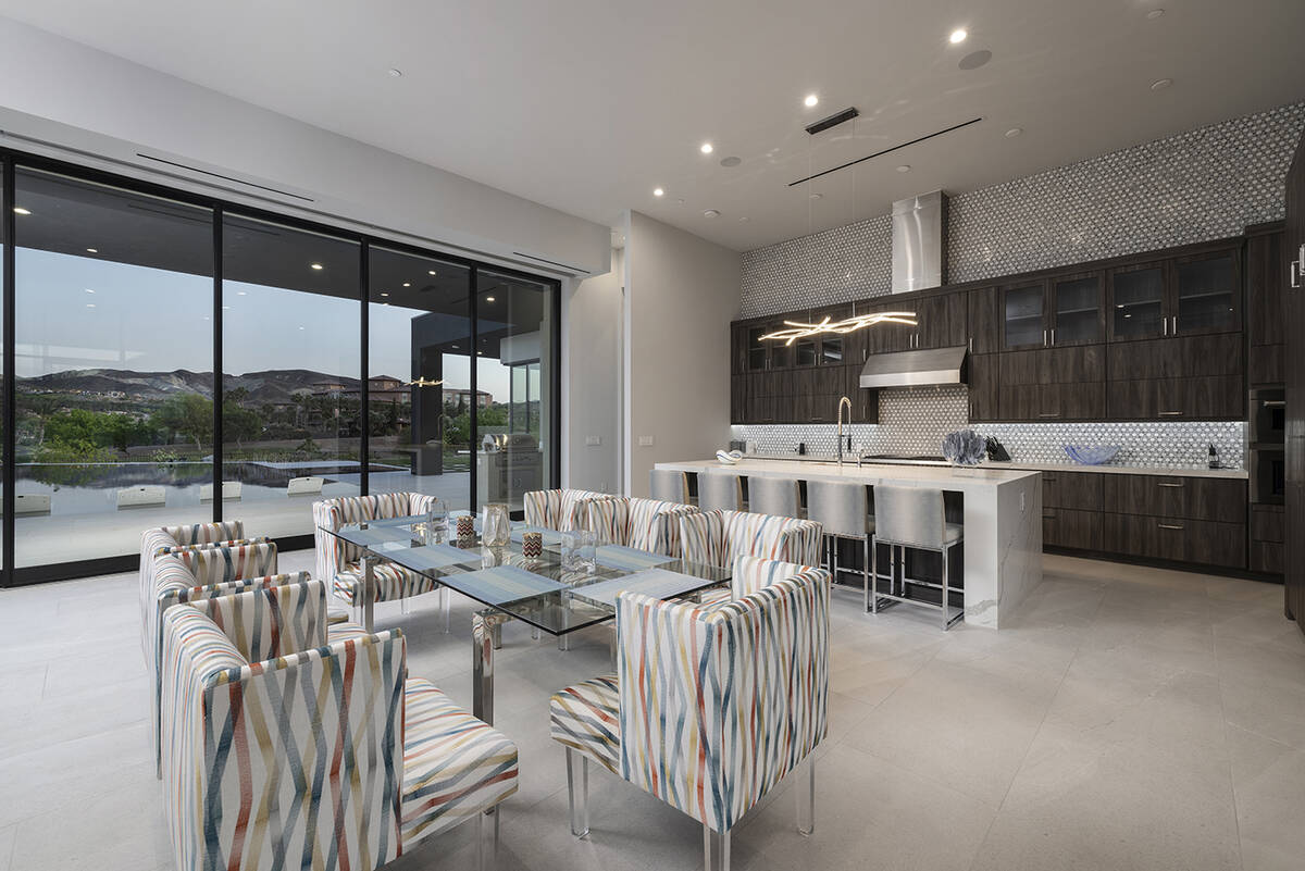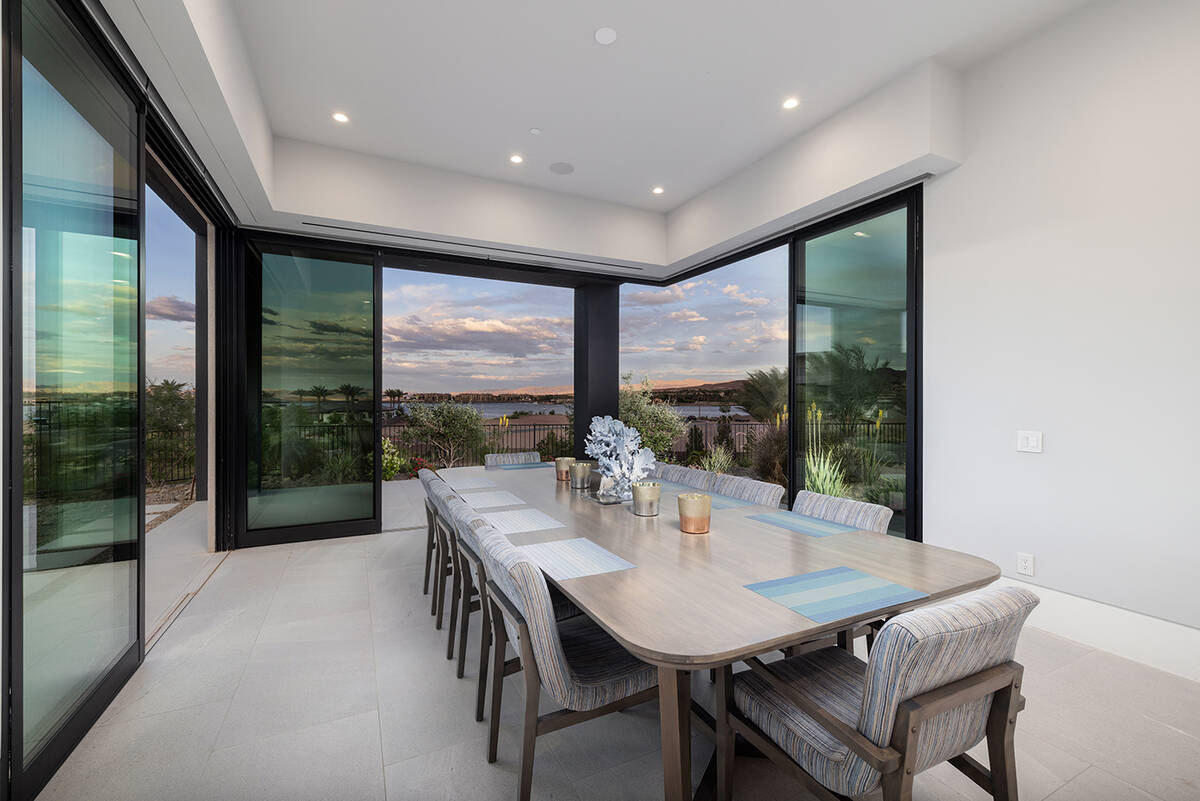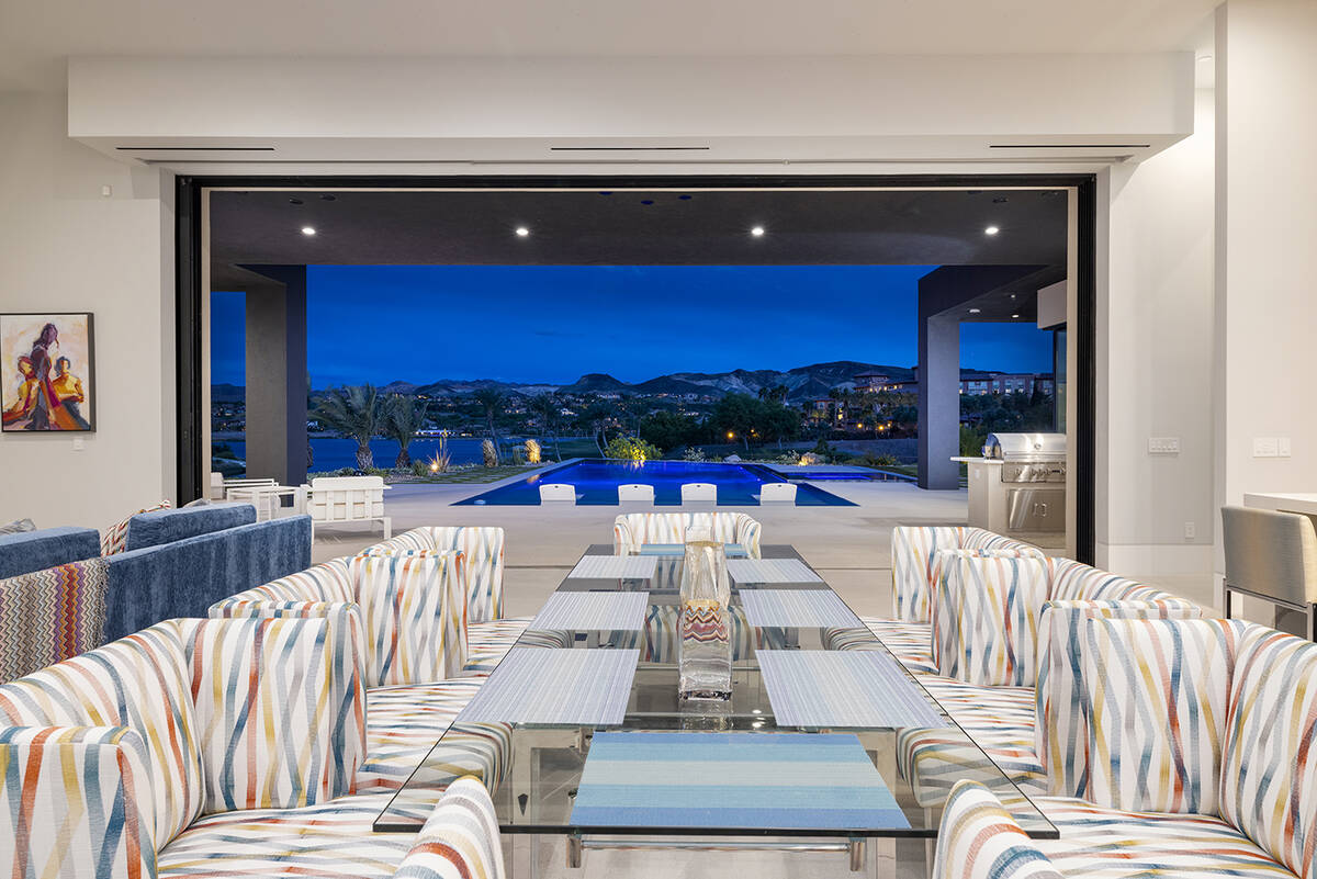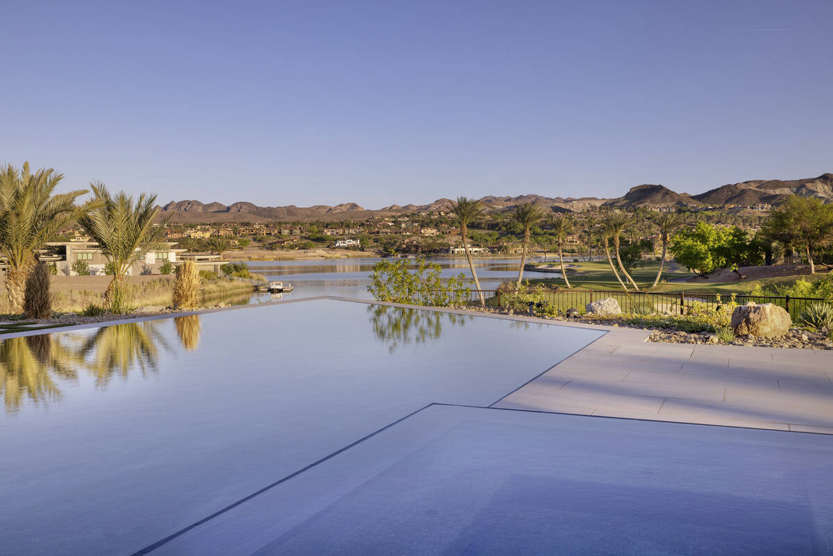 The home sits in The Estates at Reflection Bay and has views of the Reflection Bay Golf Course, mountains and the lake. It has floor-to-ceiling windows and pocketed doors to enhance the connection between indoor and outdoor spaces. The listing says that upon entering the foyer, “a grand great room that seamlessly flows into the kitchen and formal dining room offering panoramic views and flooding the space with natural light.”