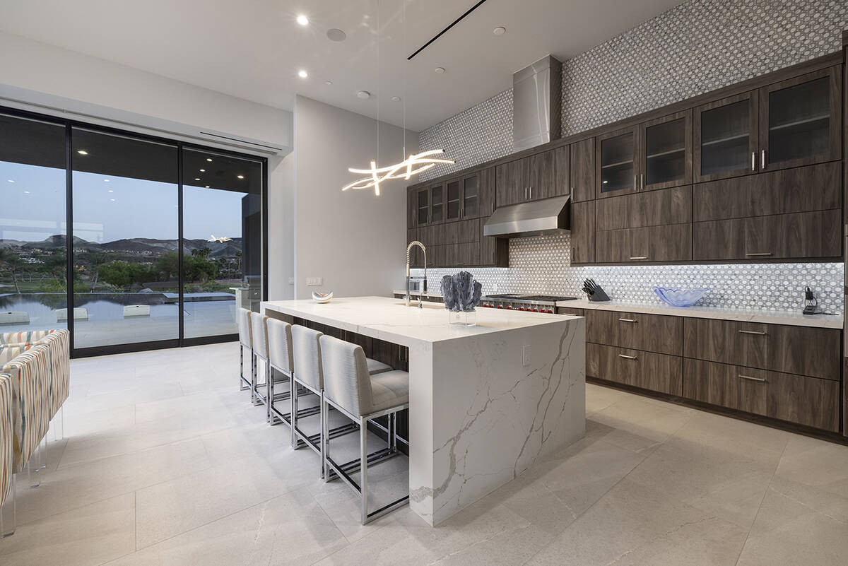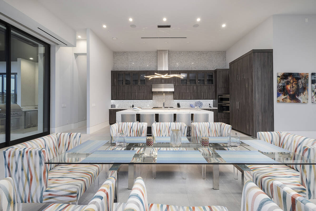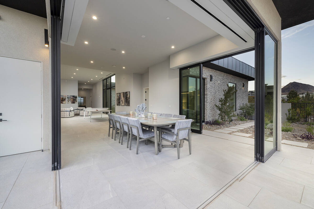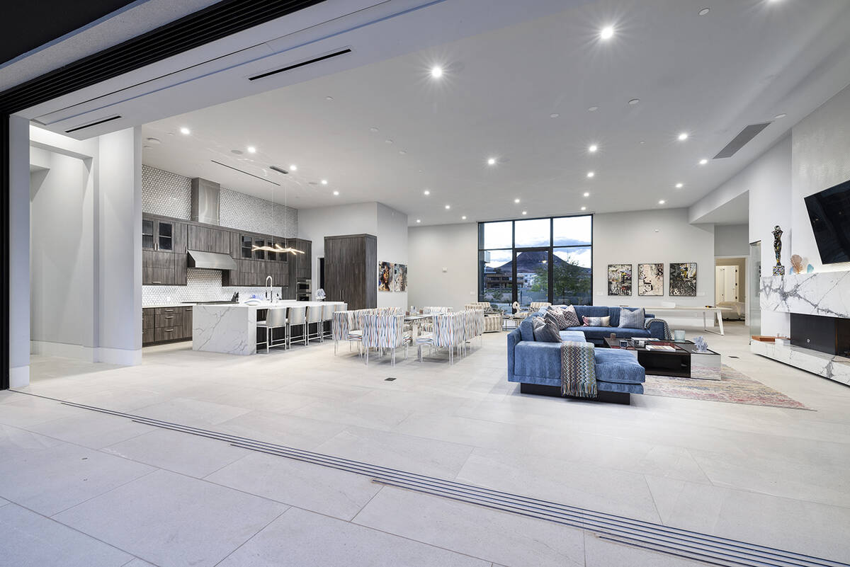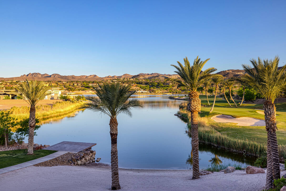 The home sits in The Estates at Reflection Bay and has views of the Reflection Bay Golf Course, mountains and the lake. It has floor-to-ceiling windows and pocketed doors to enhance the connection between indoor and outdoor spaces. The listing says that upon entering the foyer, “a grand great room that seamlessly flows into the kitchen and formal dining room offering panoramic views and flooding the space with natural light.”