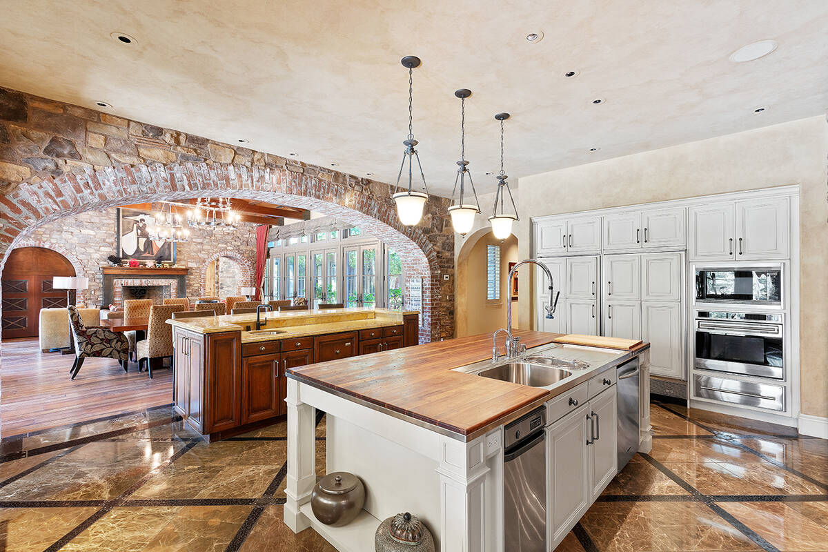 The home has a movie theater, bar, game room, office, wine cellar and elevator. It has an entertainer’s kitchen, walk-in pantry and island with bar seating.