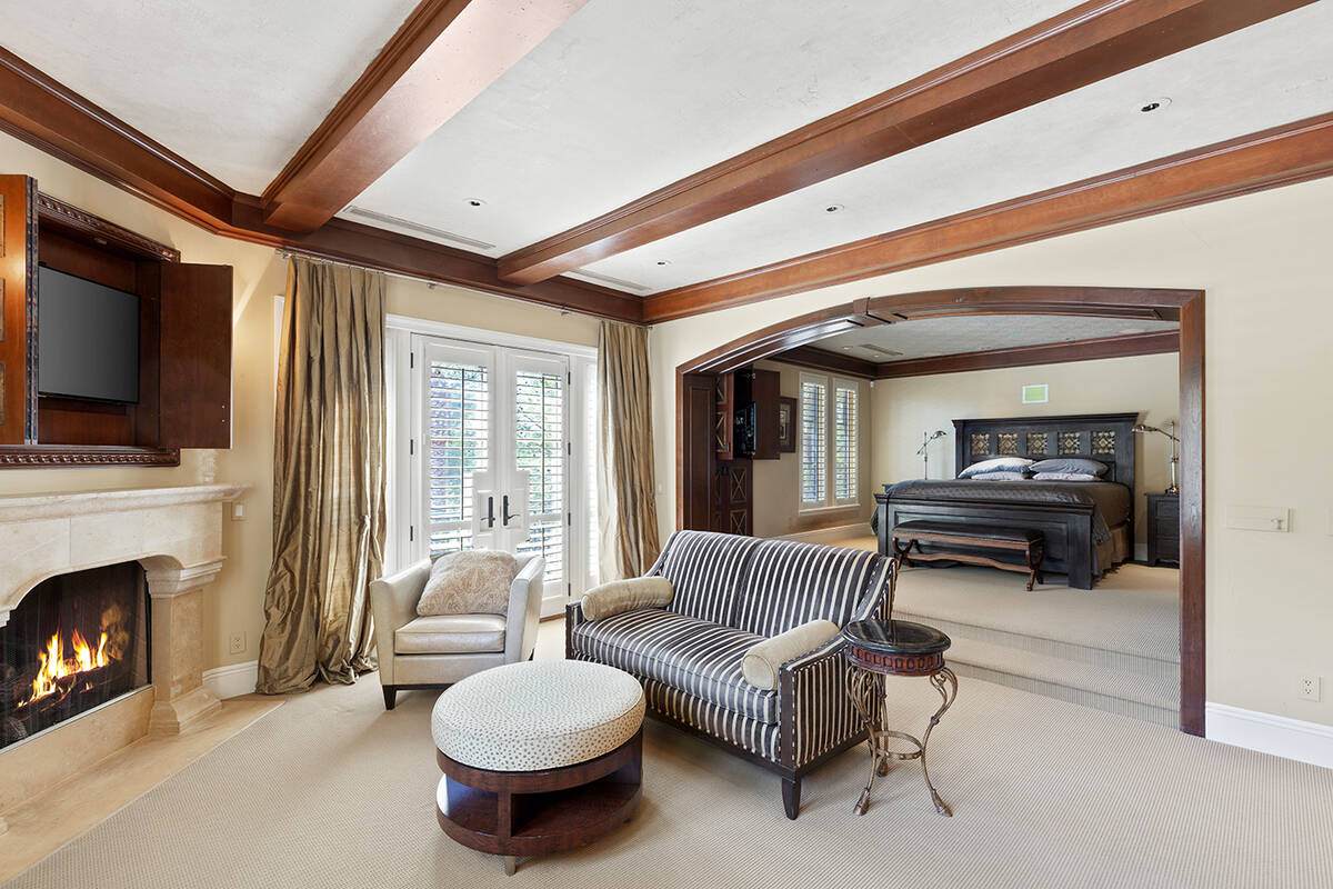 The primary bedroom suite has a balcony with a fireplace and views of the city, golf course, mountains and Strip.