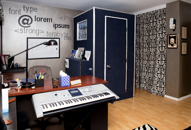 The guest bedroom is painted an iridescent dark silver. It also serves as Jimmy Slonina’s office, and houses his soundproof booth where he does commercial voice-over work and editing. One wall holds memorabilia from his many gigs, including emceeing Pink’s “The Truth About Love” tour and being in the original cast of “Le Rêve” at Wynn Las Vegas.