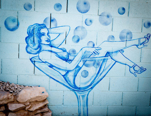 The backyard has been maximized for entertaining, with lots of seating, a large dining table beneath an awning and potted vines winding up the support posts. On the far wall, visible from the interior windows, is a wide, original mural of the Strip in silhouette and a reproduction of one of Robin Slonina’s paintings with a woman perched in a martini glass.