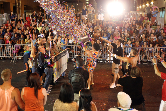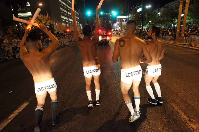 Members of the GayVegas.com entry march in the 16th Annual Las Vegas PRIDE Night Parade in downtown Las Vegas Friday, Sept. 5, 2014. The event supports the lesbian, gay, bisexual and transgender community. (K.M. Cannon/Las Vegas Review-Journal)