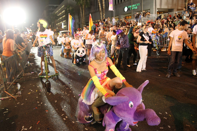 Participants march in the 16th Annual Las Vegas PRIDE Night Parade in downtown Las Vegas Friday, Sept. 5, 2014. The event supports the lesbian, gay, bisexual and transgender community. (K.M. Cannon/Las Vegas Review-Journal)