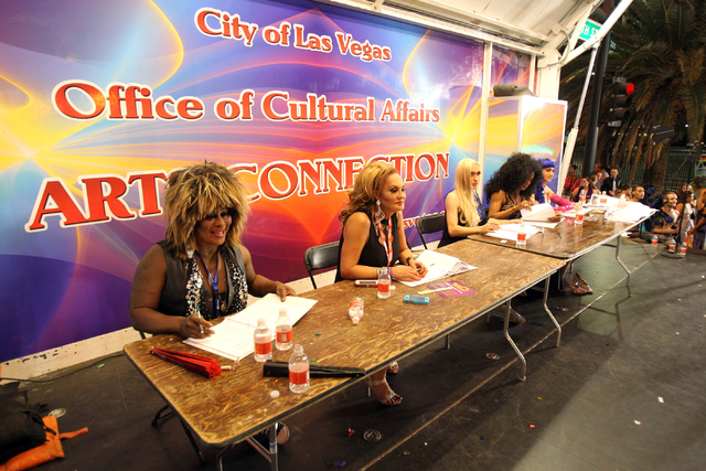 Judges, including Larry Edwards, left, and Jennifer Warner, second from left, check out entries in the 16th Annual Las Vegas PRIDE Night Parade in downtown Las Vegas Friday, Sept. 5, 2014. The event supports the lesbian, gay, bisexual and transgender community. (K.M. Cannon/Las Vegas Review-Journal)
