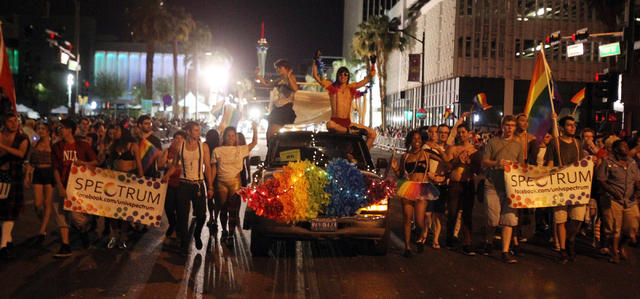 Members of the UNLV Spectrum entry march in the 16th Annual Las Vegas PRIDE Night Parade in downtown Las Vegas Friday, Sept. 5, 2014. The event supports the lesbian, gay, bisexual and transgender community. (K.M. Cannon/Las Vegas Review-Journal)