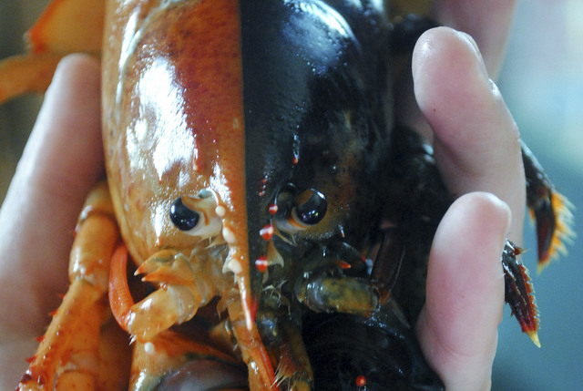 The lobster at the Gulf of Maine Research Institute is half orange and half brown.