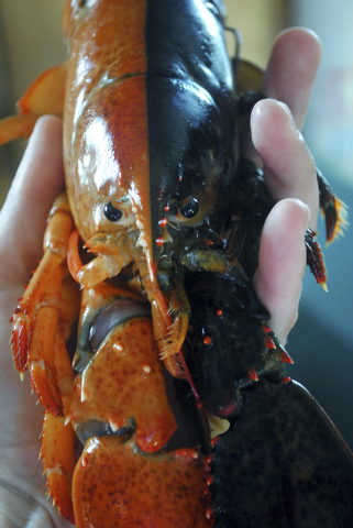 The lobster at the Gulf of Maine Research Institute is half orange and half brown.