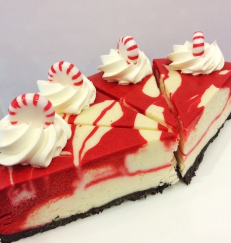 Vanilla-bean cheesecake swirled with peppermint rests on a chocolate-cookie crust and is topped with whipped cream and a peppermint kiss, $6.75 a slice, $45 for a whole cake.