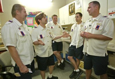 One guy isn't wearing a uniform, and he looks familiar. It's Mr. Edwards of Bentonville, Ark. And staring at him makes me remember forgetting to bundle his three new bags with his golf bag from yesterday.