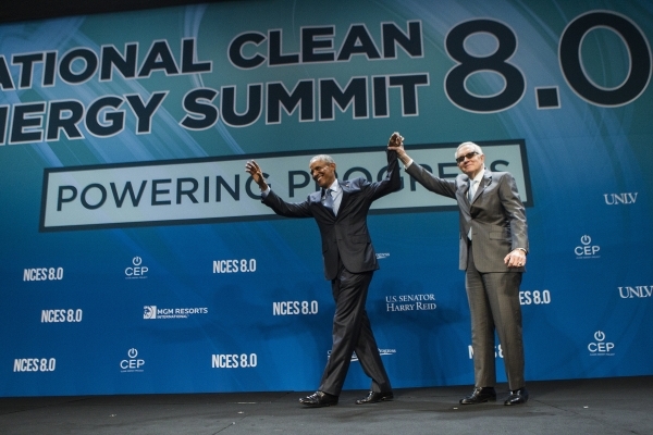 President Barack Obama, left, and U.S. Sen. Harry Reid, D-Nev., wave at the crowd after addressing the crowd at the National Clean Energy Summit 8.0 at Mandalay Bay casino-hotel in Las Vegas Monday, Aug. 24, 2015. Erik Verduzco/Las Vegas Review-Journal Follow @Erik_Verduzco
