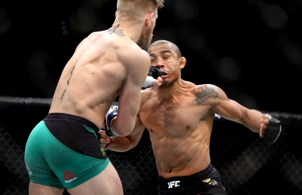 Conor McGregor, left, makes a solid connection to knock down Jose Aldo during a featherweight title bout at UFC 194 at the MGM Grand Garden Arena on Saturday, Dec. 12, 2015, in Las Vegas. McGregor won by a first round knock out. Erik Verduzco/Las Vegas Review-Journal Follow @Erik_Verduzco