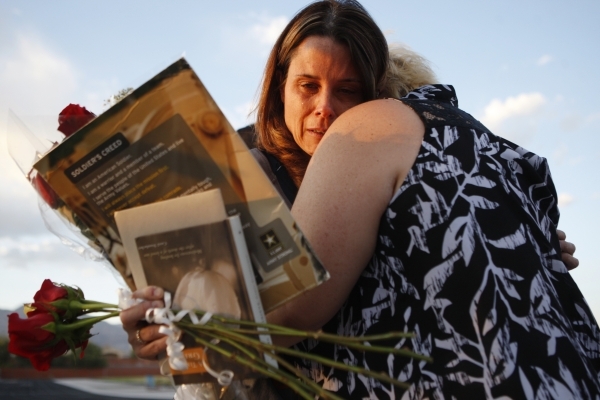 Jamie Diedrich, mother of Joshua Phillips who died in an U.S. Army airborne training accident, embraces friend Annjanette Ranney during a candle light vigil for her son at the Legacy High School football field in North Las Vegas Sunday, April 19, 2015. Joshua Phillips was remembered by friends and family at his former high school where he played football and wrestling. Erik Verduzco/Las Vegas Review-Journal Follow @Erik_Verduzco