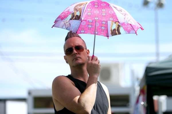 Matthew Gucu waits for his daughter holding her umbrella at the Container Park in downtown Las Vegas Sunday, March 15, 2015. Erik Verduzco/Las Vegas Review-Journal Follow @Erik_Verduzco