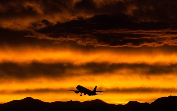 A Virgin America flight departs from McCarran International Airport as shown from the runway viewing area off of Sunset Road in Las Vegas on Wednesday, July 29, 2015. CHASE STEVENS/LAS VEGAS REVIEW-JOURNAL Follow him @csstevensphoto