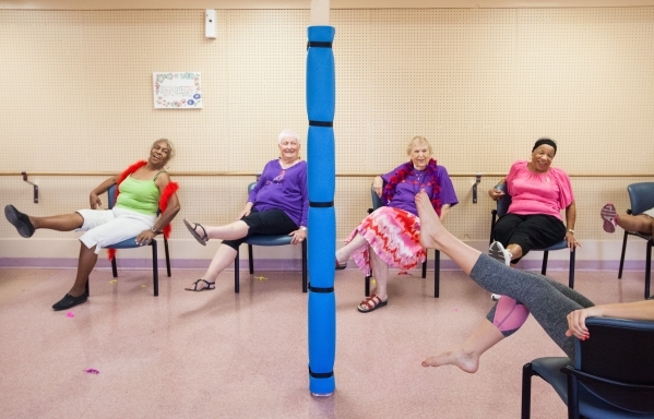 Seventy-nine-year-old Betty Cleveland, from left, Judy England, 73, Paulisca Buckholz, 84, and Dee Gordon, 81, participate in a burlesque dance class at Derfelt Senior Center in Lorenzi Park in Las Vegas on Thursday, Oct. 1, 2015. It was the first time the class was being held. Chase Stevens/Las Vegas Review-Journal Follow @csstevensphoto