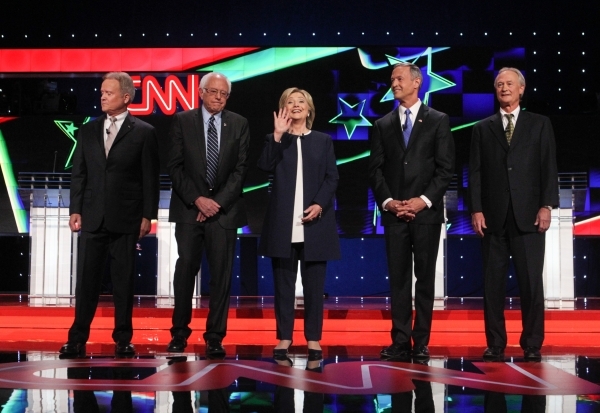 Democratic presidential candidates, from left, Jim Webb, Bernie Sanders, Hillary Clinton, Martin O‘Malley and Lincoln Chafee pose before the CNN Democratic presidential debate at the Wynn hotel-casino in Las Vegas on Tuesday, Oct. 13, 2015. Chase Stevens/Las Vegas Review-Journal Follow @csstevensphoto
