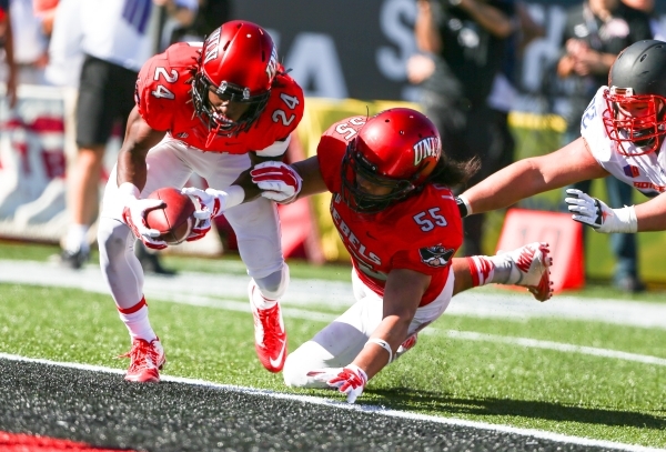 UNLV defensive back Fred Wilson (24) scores a touchdown after a fumble recovery against Boise State as UNLV linebacker Tau Lotulelei (55) looks on during a football game at Sam Boyd Stadium in Las Vegas on Saturday, Oct. 31, 2015. Chase Stevens/Las Vegas Review-Journal Follow @csstevensphoto