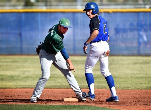 Green Valley‘s A.J. Amelburu, left, points out Basic‘s Cory Wills shoe on top of his own at second base during a high school baseball game at Basic High School on Monday, March 23, 2015 in Henderson. Wills was called safe. (David Becker/Las Vegas Review-Journal)