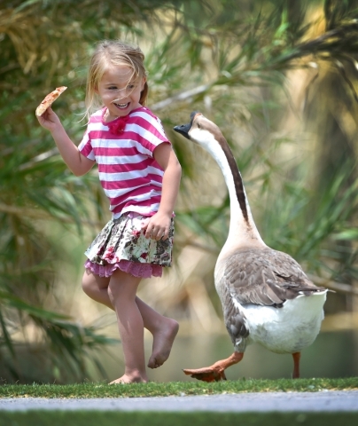 Jordyn Farnsworth smiles as she runs from a goose at Floyd Lamb Park at Tule Springs on Friday, June 5, 2015. The 680 acre park in the northwest part of the valley, features wildlife, lush vegetation, lakes and views of the Sheep and Spring Mountain ranges. (David Becker/Las Vegas Review-Journal)
