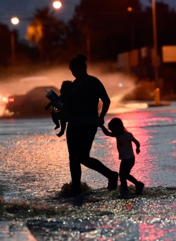 A mother ferries her children as she crosses a flooded Pennwood Avenue just east of Decatur Boulevard after a thunderstorm passed through the west valley on Monday, July 6, 2015. (David Becker/Las Vegas Review-Journal)