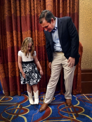 Republican presidential candidate, Sen. Ted Cruz, R-Texas, right, compares his cowboy boots with Heaven McMillian, 6, after he spoke at a campaign event at Sun City Anthem in Henderson on Friday, Aug. 14, 2015. (David Becker/Las Vegas Review-Journal)