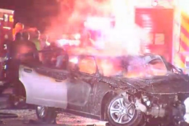 The person who was killed was a man in his forties who was driving the vehicle that did not catch on fire. A woman and ten-year-old boy, who were in the vehicle with the man, were taken to a hospital in serious condition.